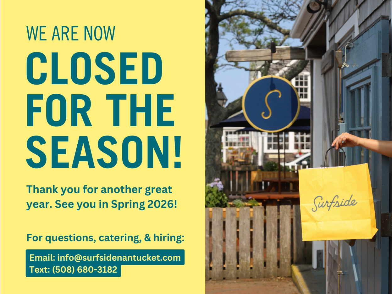 Georgetown Events Hospitality Group, founders and owners of Millie’s Nantucket, are now bringing Surfside to the Island. We have a laid back atmosphere with take-out service, margaritas, and prime outdoor seating. Customers can expect fast, delicious bites coupled with a commitment to good service.